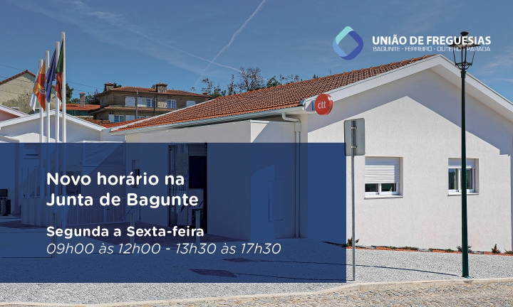 Informamos que a Junta de Freguesia de Bagunte tem um novo horário de atendimento, sendo este de 2ª a 6ª feira, das 9h00 às 12h00 e das 13h30 às 17h30.