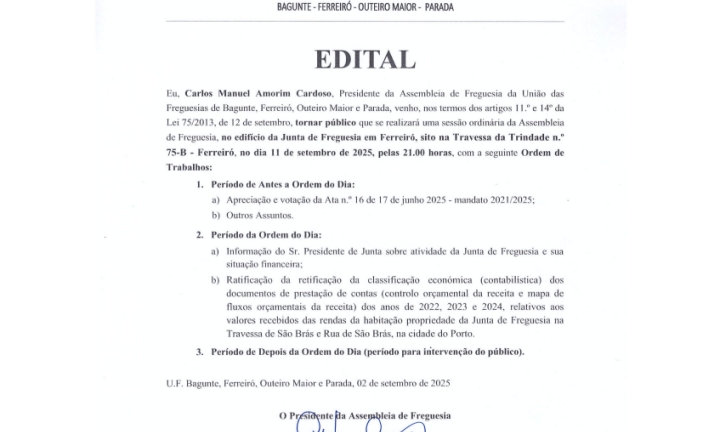 Informam-se todos os fregueses que no próximo dia 11 de setembro, pelas 21h00, realiza-se uma nova sessão Ordinária da Assembleia de Freguesia, no edifício da Junta de Freguesia de Ferreiró, na Travessa da Trindade 75-B, em Ferreiró.
