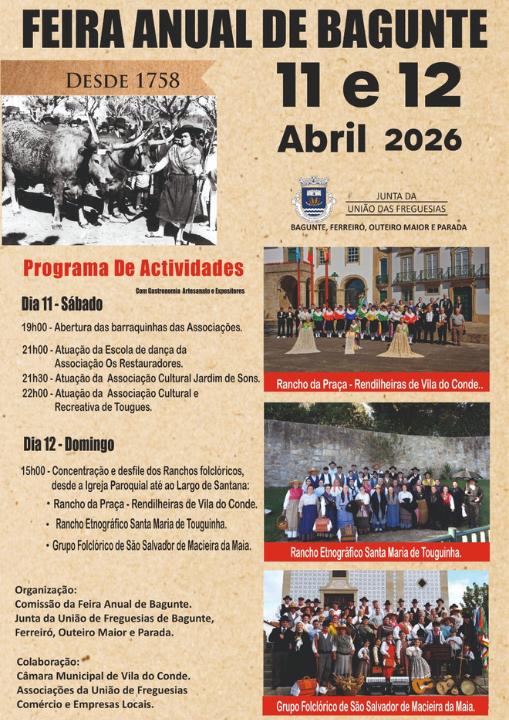 A histórica Feira Anual está de regresso a Bagunte nos próximos dias 11 e 12 de abril! Esta é uma tradição que se mantém viva desde 1758, celebrando a nossa identidade, a cultura local e o forte espírito de comunidade que tanto nos caracteriza.