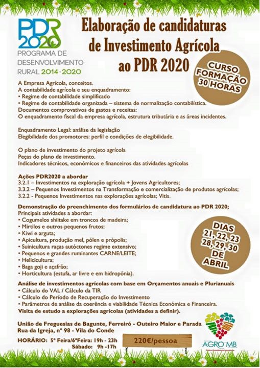 Estão a decorrer as inscrições para o curso de formação “ELABORAÇÃO DE CANDIDATURAS DE INVESTIMENTO AGRÍCOLA AO PDR 2020”, na União de Freguesias de Bagunte.